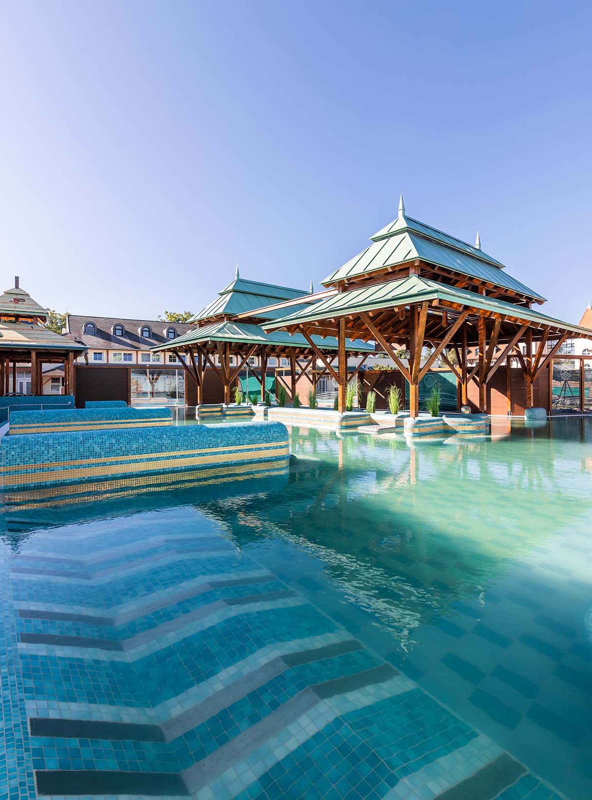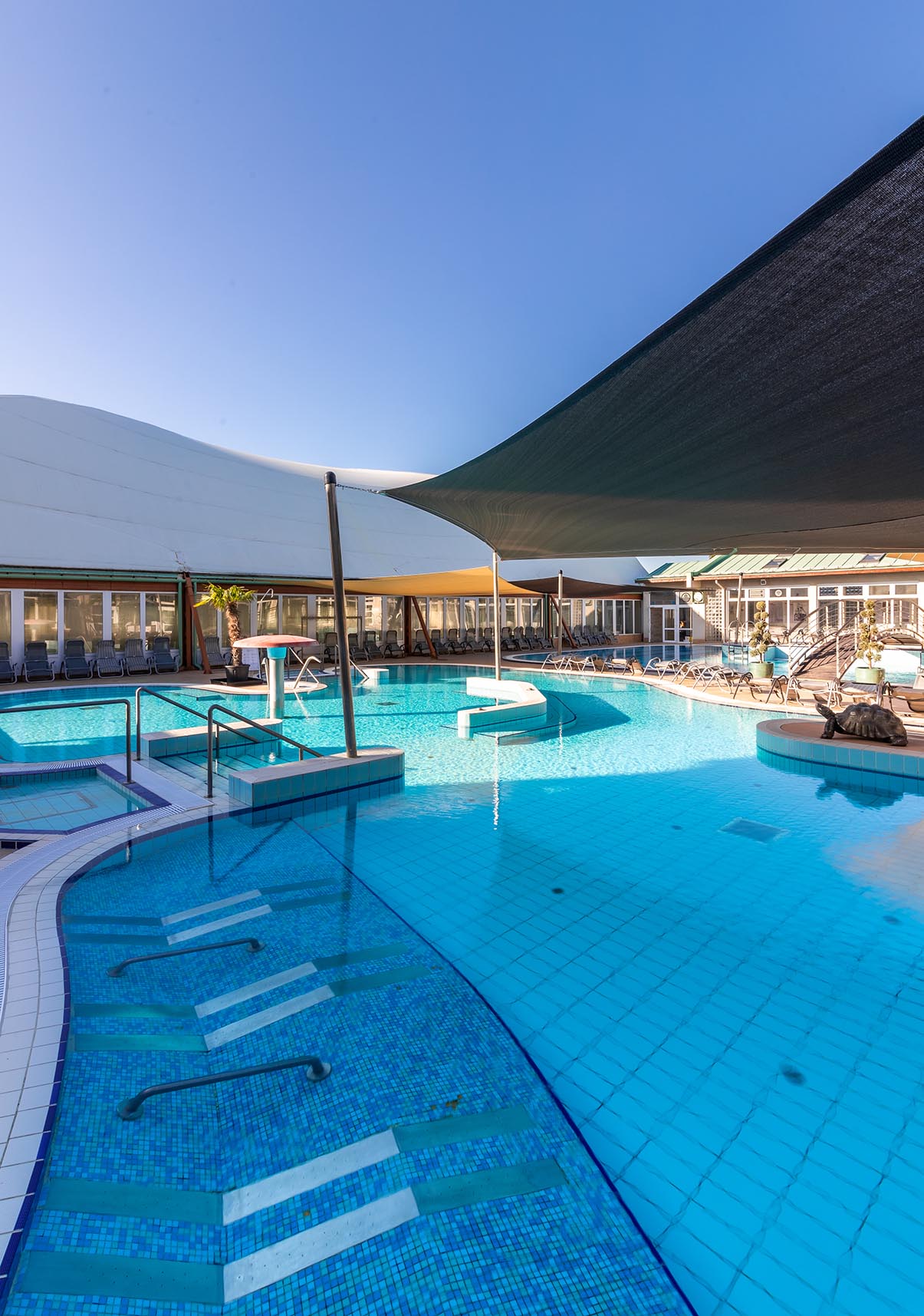 V našich viac ako 50-ročných kúpeľoch v Mosonmagyaróvári momentálne čaká na hostí sedem – celoročne prevádzkovaných – bazénov s rôznou teplotou vody, rozsiahle zelené plochy, impozantné vnútorné oddychové priestory, množstvo ležadiel a gastronomické prevádzky (Coral Restaurant, Viva la Langos, Laguna Bistro) pre tých, ktorí túžia po liečení, oddychu či športe.